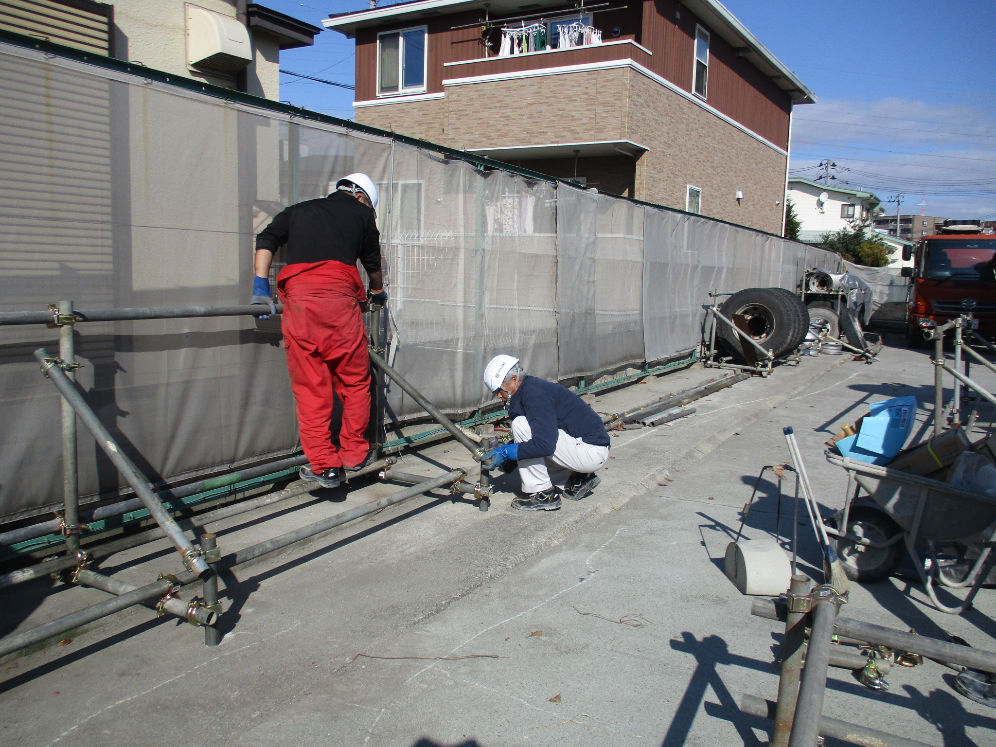 タイヤ置き場制作中、DIY担当の親方I さん&助手Eさん