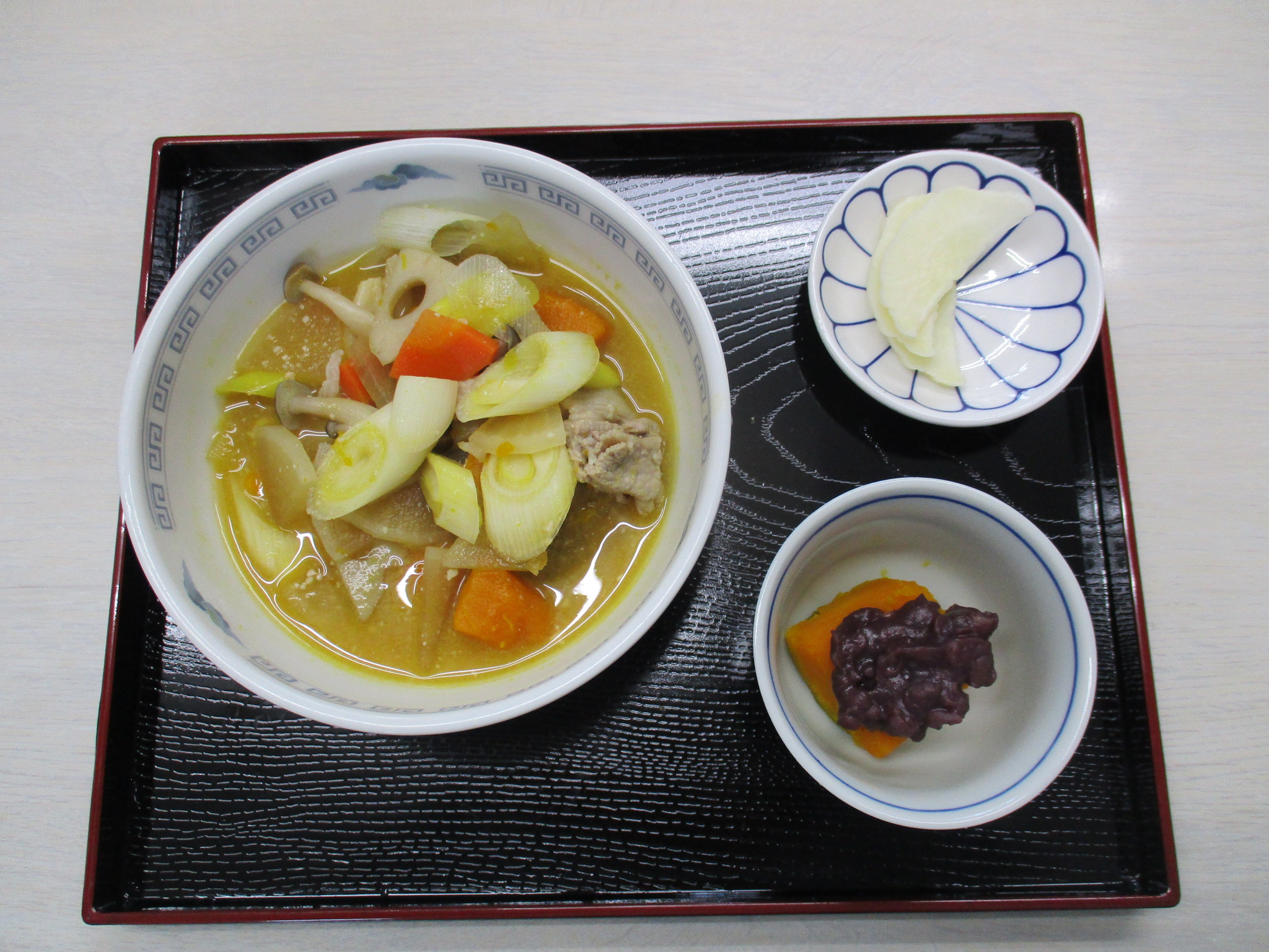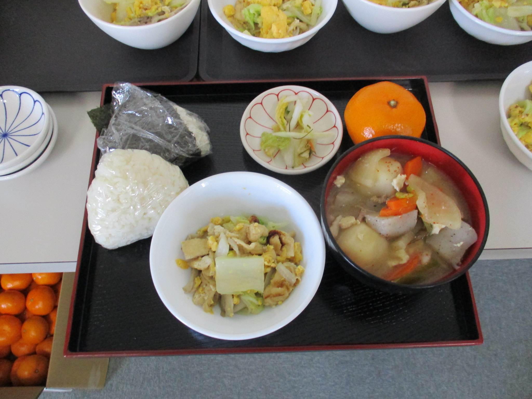 豚汁&炒り卵中華風も‼おかずがあるとラッキーデー⁈デザートでみかんもありました♪